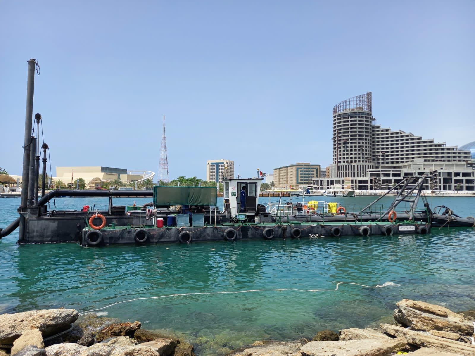 Union Dredgers & Marine Contracting Hammerhead dredger is currently in operation and being utilised to clean a navigational channel to allow the safe passage of vessels. The channel is primarily used as a transport route for RTA ferries to reach a nearby marine transport station. The Hammerhead dredger is perfect for maintenance dredging works given its size and ease of mobilisation. The works include both pre and post marine surveys to ensure required levels are met in addition to the transfer of materials from the cofferdam to the final material dumping location.